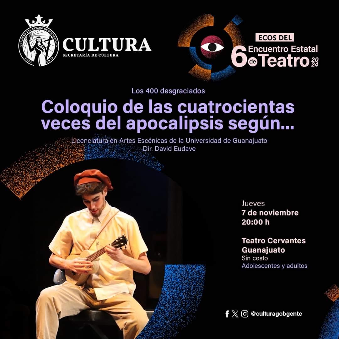 Guanajuato, Gto., a 07 de noviembre de 2024.- Como parte del programa “Ecos del 6° Encuentro Estatal de Teatro 2024”, se presentará la obra Coloquio de las cuatrocientas veces el apocalipsis según...”, comedia desarrollada por estudiantes de la Licenciatura en Artes Escénicas del Campus Guanajuato y que tendrá lugar este jueves 7 de noviembre en el Teatro Cervantes a partir de las 20:00 horas con acceso gratuito.