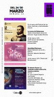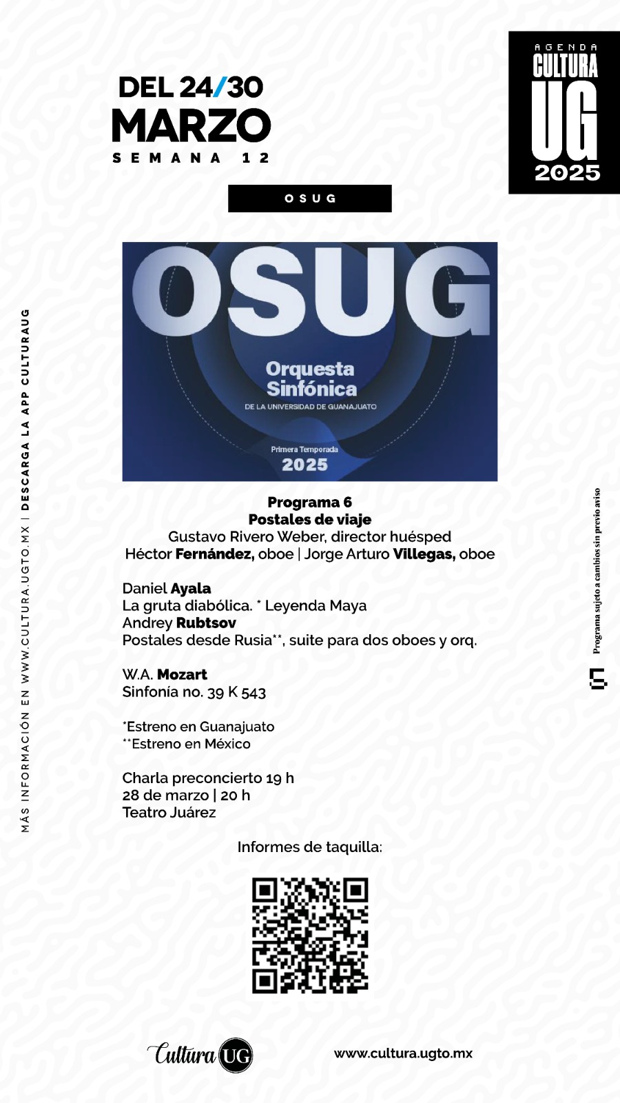 En cuanto a Música, la Orquesta Sinfónica de la UG presentará el sexto programa de su temporada titulado “Postales del año”, con Gustavo Rivero Weber como director huésped y dos solistas de oboe: Héctor Fernández y Jorge Arturo Villegas. La cita será en el Teatro Juárez el viernes 28 de marzo a las 20:00 horas, donde se interpretará la Sinfonía no. 39 K 543, de Wolfgang Amadeus Mozart, además del estreno de las obras La gruta diabólica, de Daniel Ayala, y Postales desde Rusia, de Andrey Rubtsov. Los boletos están disponibles en la taquilla del teatro.