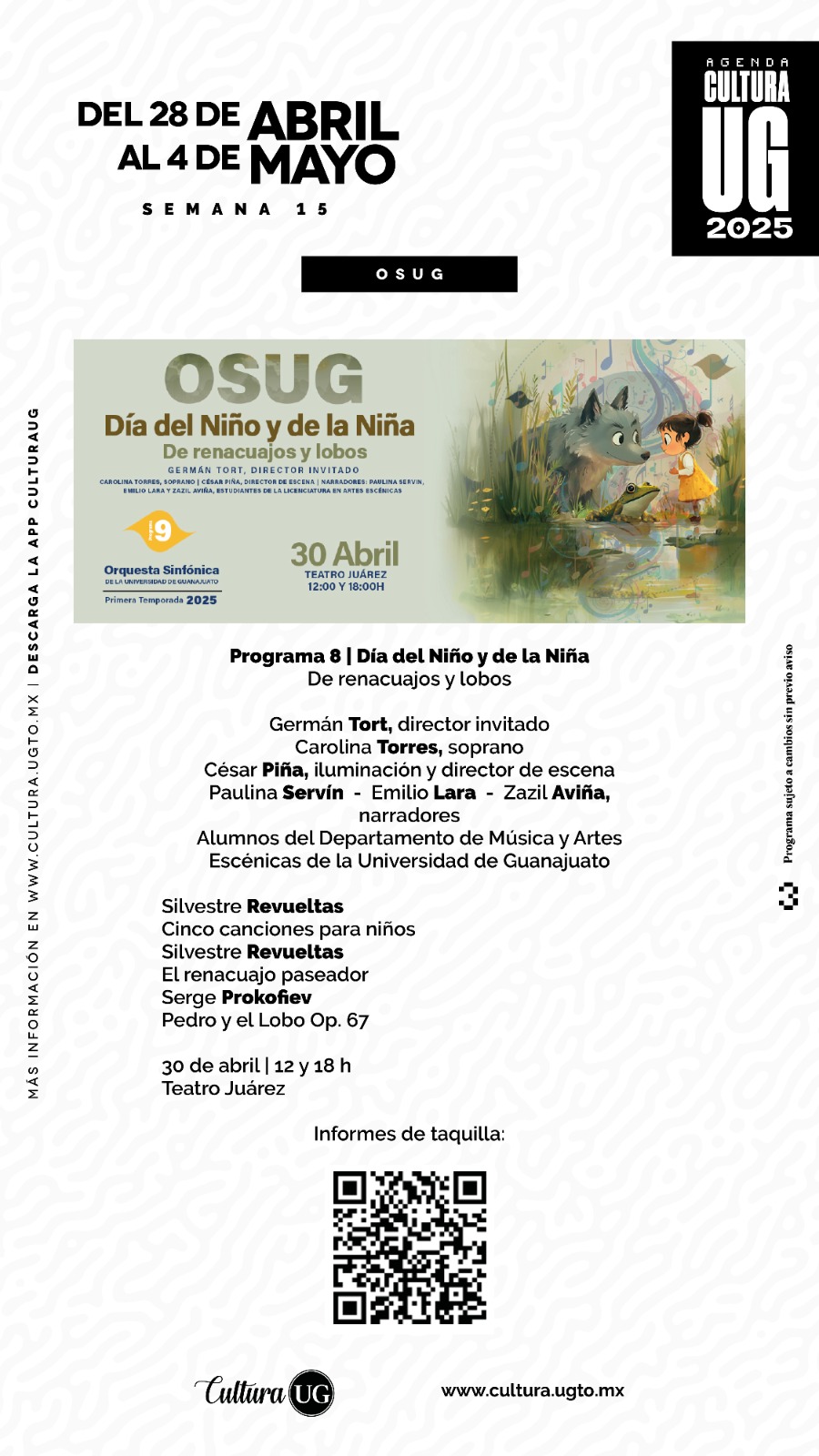 La Orquesta Sinfónica de la UG (OSUG) se presentará este 30 de abril en el Teatro Juárez con dos funciones, a las 12:00 y a las 18:00 horas bajo la batuta del director invitado Germán Tort, con la interpretación de las canciones infantiles de Silvestre Revueltas, Cinco canciones para niños y El renacuajo paseador; así como la obra de Serge Prokofiev, Pedro y el Lobo Op. 67