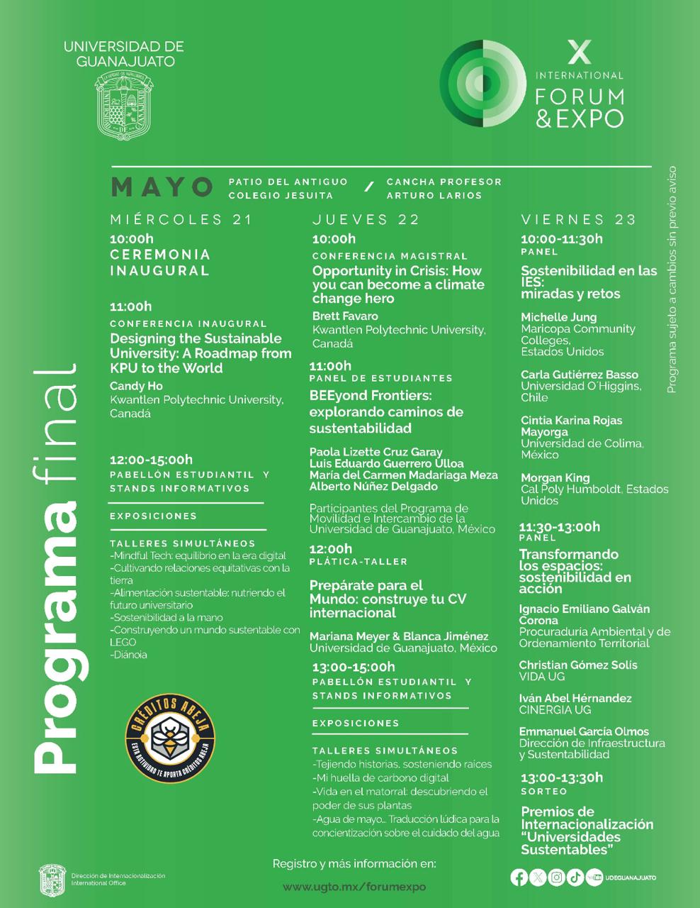 Para participar en el encuentro, se podrá realizar el registro a través de la página www.ugto.mx/forumexpo/ , ahí mismo se podrá consultar la programación completa, así como la convocatoria para el sorteo del Premio de Internacionalización, el cual contempla, como primer lugar, la cobertura de transporte aéreo internacional para participar en un evento académico en Costa Rica; el segundo premio será el pago de un curso semestral de idioma extranjero; el tercer lugar recibirá dos libros sobre sustentabilidad. Para esto, es importante asistir y participar durante los tres días del X Foro y Expo Internacional.