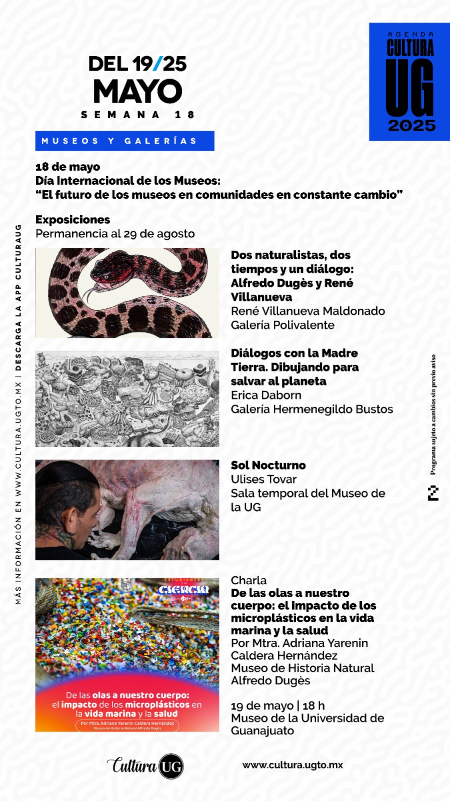 También acorde con Espiral, el 19 de mayo a las 18:00 horas, en el Museo de la UG, se desarrollará la charla “De las olas a nuestro cuerpo: el impacto de los microplásticos en la vida marina y la salud”, a cargo de la Mtra. Adriana Yarenin Caldera Hernández, colaboradora del Museo de Historia Natural Alfredo Dugès.