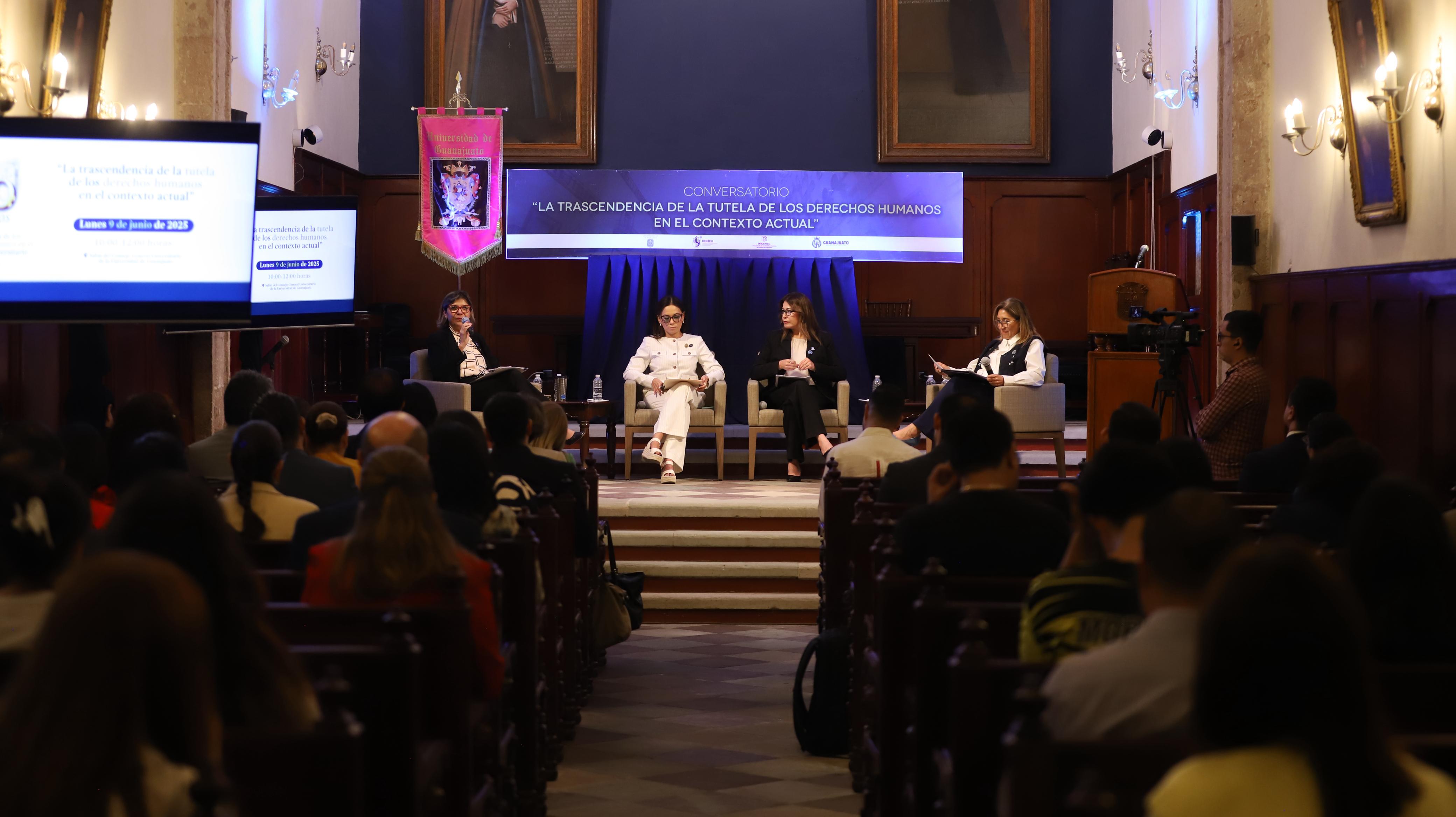 Al acto conmemorativo siguió el conversatorio "La trascendencia de la tutela de los derechos humanos en el contexto actual", con tres voces clave para tal misión en el estado de Guanajuato: la Mtra. Liz Alejandra Esparza Frausto, Secretaria de Derechos Humanos del Estado de Guanajuato; la Mtra. Karla Gabriela Alcaraz Olvera, Procuradora de los Derechos Humanos del Estado de Guanajuato; y la Mtra. María Teresa Palomino Ramos, Procuradora de Protección de Niñas, Niños y Adolescentes del Estado de Guanajuato.