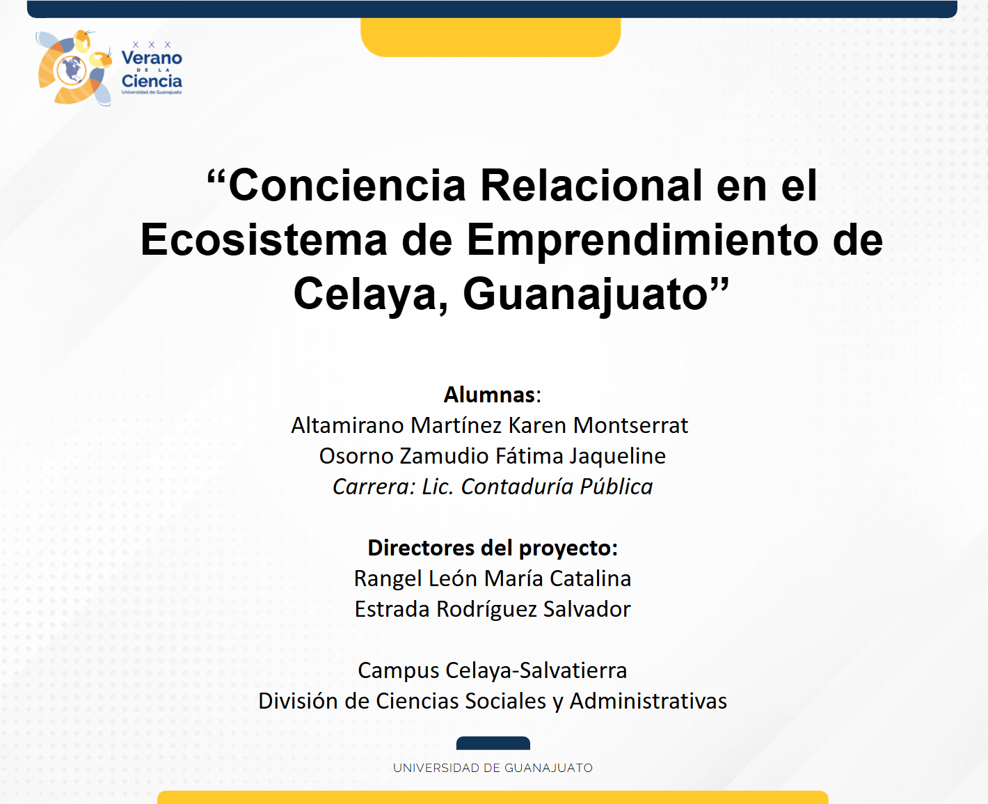 El equipo de trabajo integrado por Karen Monserrat Altamirano Martínez, Fátima Jaqueline Osorno Zamudio, ambas alumnas de la Licenciatura en Contador Público, la Mtra. María Catalina Rangel León, de la Universidad de Celaya, y el Dr. Salvador Estrada Rodríguez, de la División de Ciencias Sociales y Administrativas (DCSA) de la UG, desarrollaron este proyecto que se centra en la creación y validación de un instrumento de medición que analice la “conciencia relacional” entre emprendedore(a)s y las y los diversos actores de la región Bajío, abarcando factores como la confianza, la colaboración, el intercambio de información y la reciprocidad, todos elementos cruciales para que un ecosistema prospere.