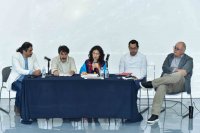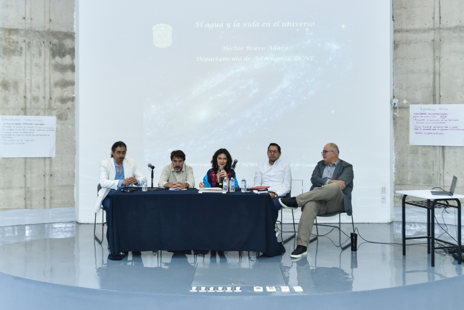 Posterior a la inauguración, se realizó el conversatorio sobre diversas perspectivas del agua, donde participaron el Dr. Héctor Bravo Alfaro, profesor-investigador del Departamento de Astronomía de la UG, quien expuso la existencia del agua y la vida en el universo, además de mencionar la conexión entre el ciclo cósmico del agua y el ciclo terrestre. Le siguió el Dr. Gabriel Medrano de Luna, del Departamento de Educación, quien hizo referencia a la tradición oral, como narraciones, leyendas y corridos guanajuatense, donde se hace alusión al recurso hídrico a través de metáforas, prosa, rimas y relatos, tal es el caso de la “La llorona”, narración tradicional de Guanajuato.