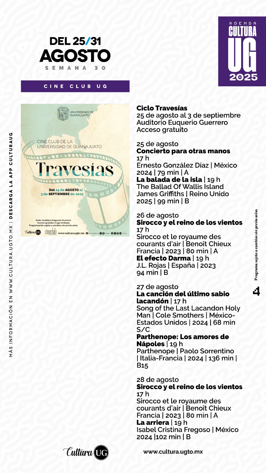 La programación está sujeta a cambios sin previo aviso. Se recomienda consultar actualizaciones en el sitio oficial www.cultura.ugto.mx, en las redes sociales de Cultura UG o en la aplicación @Cultura UG.