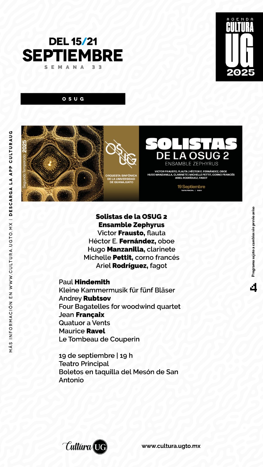 Consulta toda la programación de actividades culturales en www.cultura.ugto.mx o descarga la app CulturaUG. Programación sujeta a cambios sin previo aviso