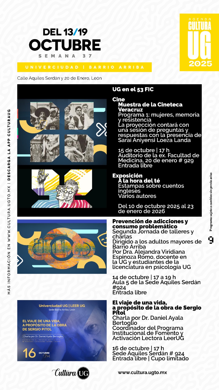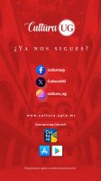 Consulta la oferta cultural de la UG en www.cultura.ugto.mx o en la app y redes sociales @CulturaUG. Programación sujeta a cambios sin previo aviso.