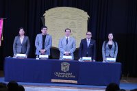 En el presídium, estuvieron presentes el Lic. Luis Rafael González Negrete, Director de Desarrollo Estudiantil, en representación de la Dra. Claudia Susana Gómez López, Rectora General de la UG; la Dra. Susana Martínez Nava, Directora del Departamento de Derecho, y la Mtra. Rosa María Pérez Vargas, Directora del Departamento de Gestión Pública.