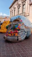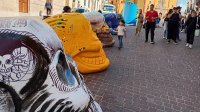 Guanajuato, Gto., a 03 de noviembre de 2025.- Desde el pasado 29 de octubre y hasta el 2 de noviembre, artistas de la Universidad de Guanajuato (UG) expusieron en las calles de la ciudad capital (Avenida Juárez y subterránea) un proyecto colectivo de intervención pictórica sobre esculturas de cráneos en gran formato.