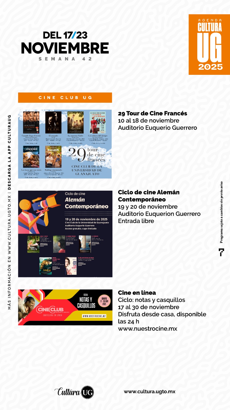 El cine llega con una programación internacional. El 29o Tour de Cine Francés se proyecta del 10 al 18 de noviembre en el Auditorio Euquerio Guerrero. El Ciclo de Cine Alemán Contemporáneo se presentará los días 19 y 20 de noviembre en el mismo recinto, con entrada libre. Además, el ciclo en línea “Notas y casquillos” estará disponible del 17 al 30 de noviembre en www.nuestrocine.mx, las 24 horas.