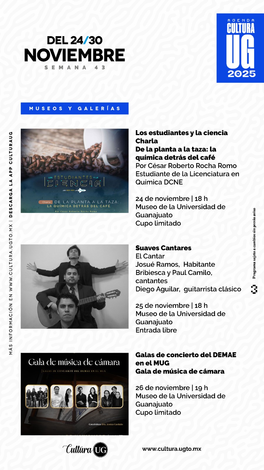 Guanajuato, Gto., a 21 de noviembre de 2025.- El arte y los eventos culturales de la Universidad de Guanajuato (UG) siguen presentes en la última semana de noviembre con conciertos, muestras de cine y exposiciones que estarán en exhibición hasta el 23 de enero de 2026.
